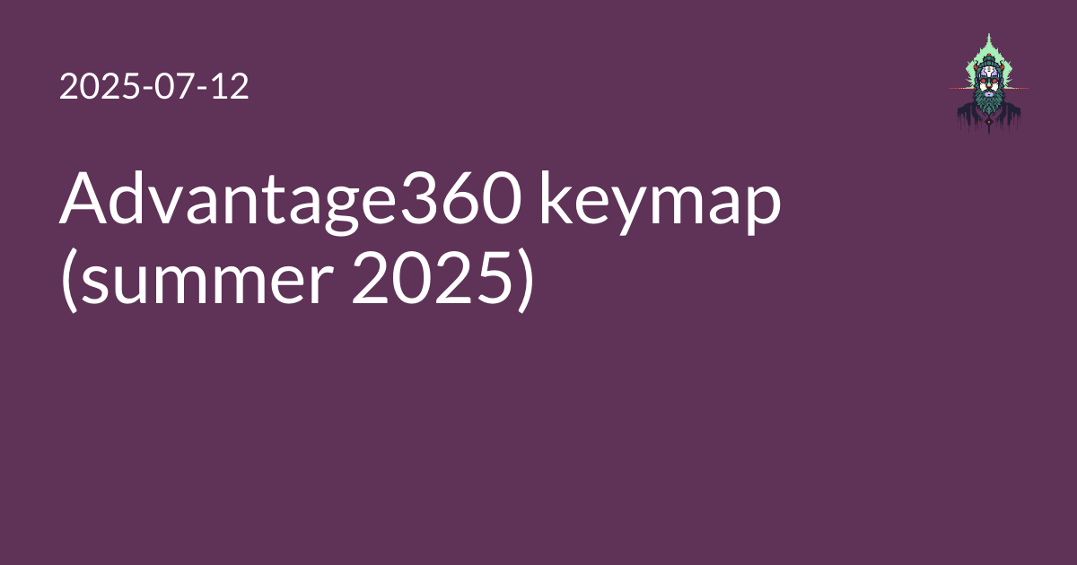 Since that first keymap, I’ve moved to an Advantage360. The primary reason for this is more portability. The ErgoDox-EZ I have does best if it’s in one place all the time. Moving it is no big deal unless you’re doing it a lot, which requires packing it up, unpacking it, and re-adjusting its tenting legs every time. The Advantage360 Pro is Bluetooth and sits at a perfect tent by default, which means setting it up at a temporary desk at work is a lot easier. (It’s still a lot less convenient than just using a laptop keyboard; if I could use one of those without any pain, I would.)