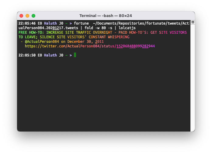 Some Twitter accounts write really cool microfiction, which makes excellent fortune databases.