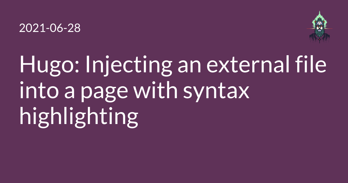 When I want to include code longer than a few lines in a document published with Hugo, it is sometimes convenient to keep that code in a separate file rather than to inline it with Markdown indentation or code fences.