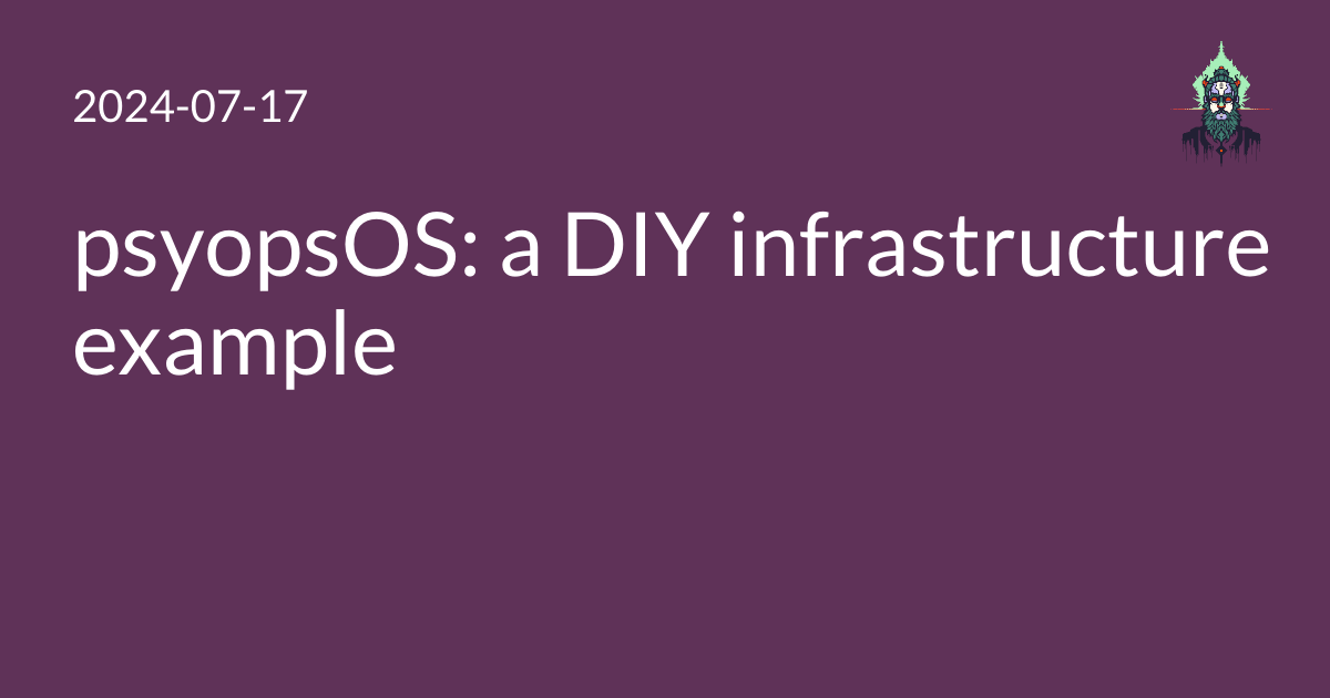 Unfortunately, once I started working on this, I found it far more interesting than working on the cluster itself, and I’ve gotten side tracked onto two major projects. One of those side track projects is progfiguration, an “infrastructure as code, but like, actual code” framework for writing system configuration that uses vanilla Python instead of YAML. The other side track project is psyopsOS, which is what this post is about.