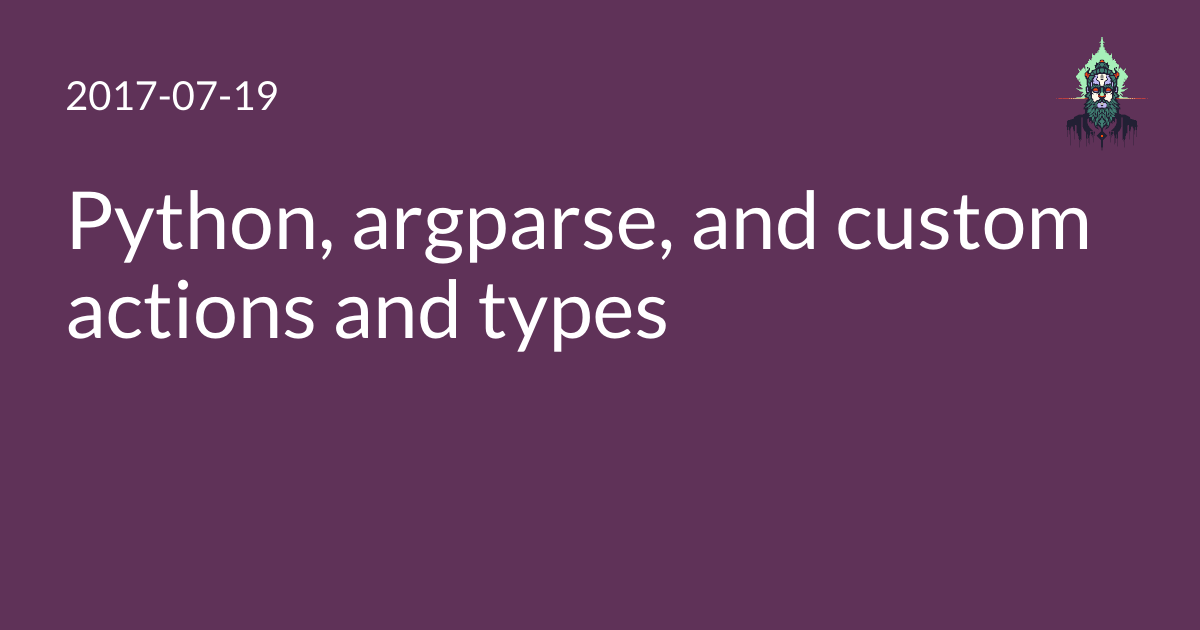 Custom actions and types can be a powerful way to transpose or validate command line arguments at argument parsing time. What I’ve done is a simple transposition; other, more complex transposition might involve creating a custom object from command line input (which is of course always going to come in as a string). argparse has support for some basic types like dates and numbers built in, but this lets you add support for any number of custom classes whenever you like. It’s also useful for parameter validation, like ensuring an argument is a valid IP address or XML document.