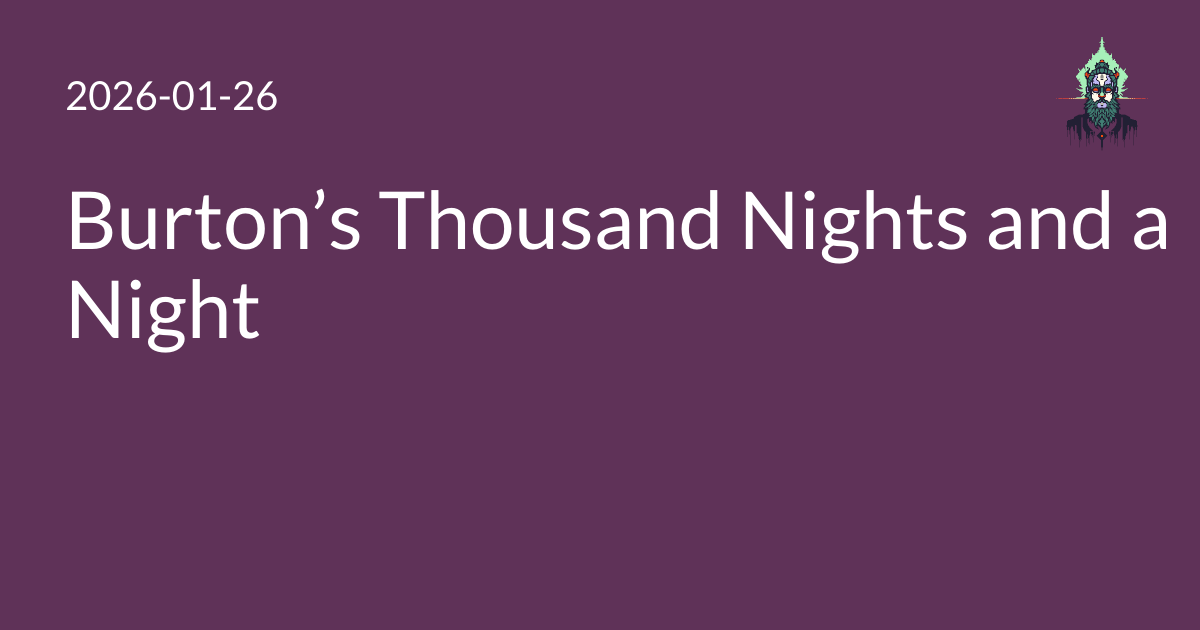 Burton shared [John] Payne’s enthusiasm for archaic and forgotten words. The style Burton achieved can be described as a sort of composite mock-Gothic, combining elements from Middle English, the Authorized Version of the Bible and Jacobean drama. Most modern readers will also find Burton’s Victorian vulgarisms jarring, for example ‘regular Joe Millers’, ‘Charleys’, and ‘red cent’. Burton’s translation of the Nights can certainly be recommended to anyone wishing to increase their word-power: ‘chevisance’, ‘fortalice’, ‘kemperly’, ‘cark’, ‘foison’, ‘soothfast’, ‘perlection’, ‘wittol’, ‘parergon’, ‘brewis’, ‘bles’, ‘fadaise’, ‘coelebs’, ‘vivisepulture’, and so on. ‘Whilome’ and ‘anent’ are standard in Burton’s vocabulary. The range of vocabulary is wider and stranger than Payne’s, lurching between the erudite and the plain earthy, so that Harun al-Rashid and Sinbad walk and talk in a linguistic Never Never Land.