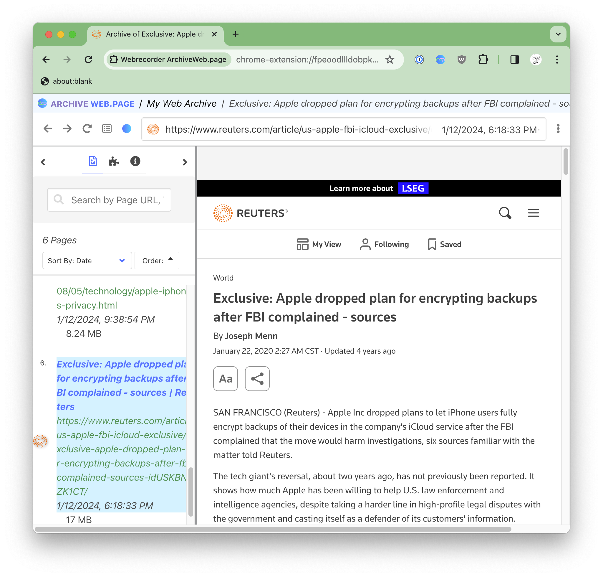 Once you’ve finished, an archive is saved in the extension, and you can “download” (actually just copying from the extension’s local storage) the resulting WACZ archive.