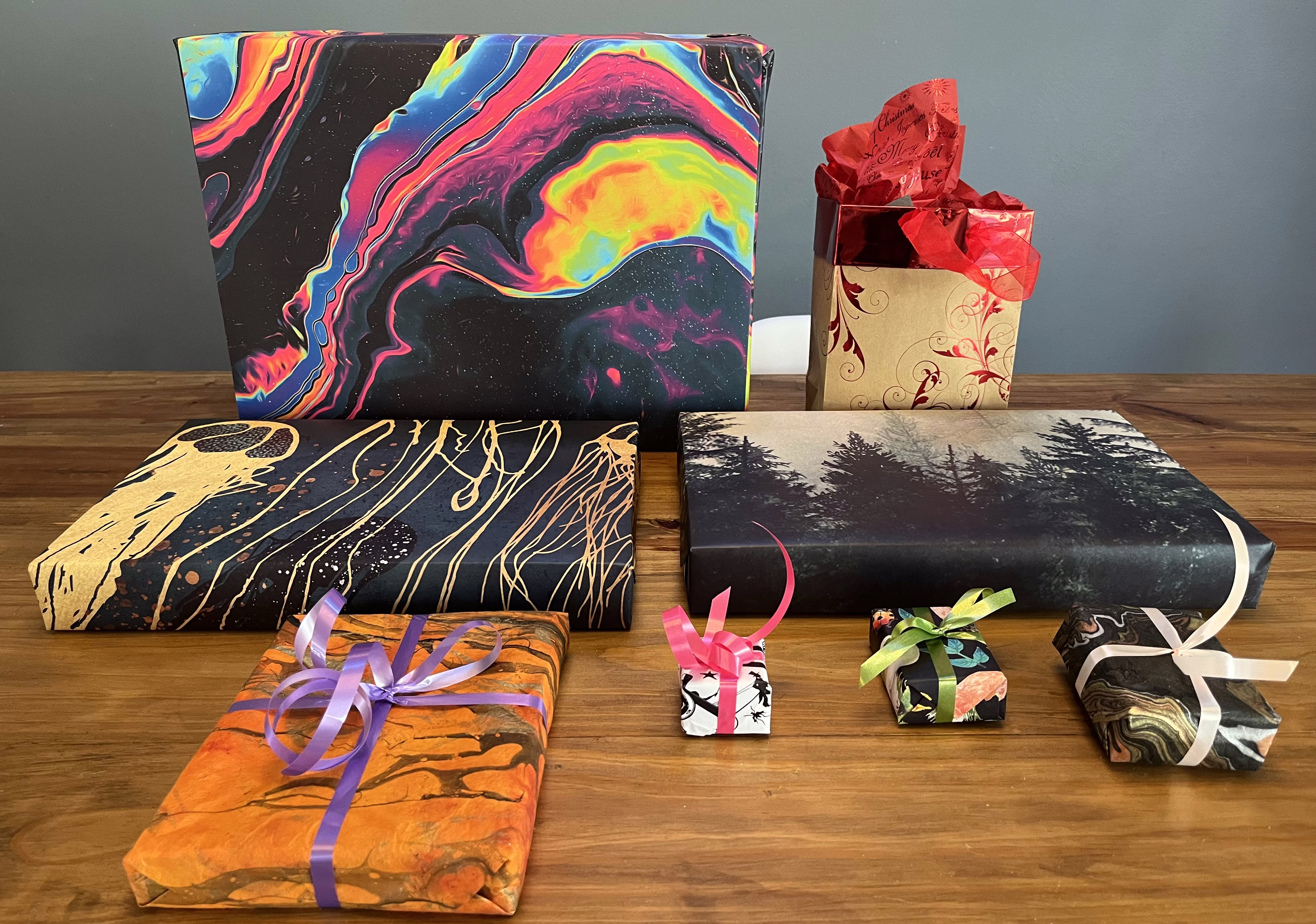 The first step is paper selection. Two specific recommendations: Paper Source which I tend to visit in person for very fine single sheets, and Society6 which has infinite variety but ships a little slow. I tend to keep brown paper on hand, especially for bulky items, and I also buy metalic/reflective paper from Walmart etc whenever is convenient.