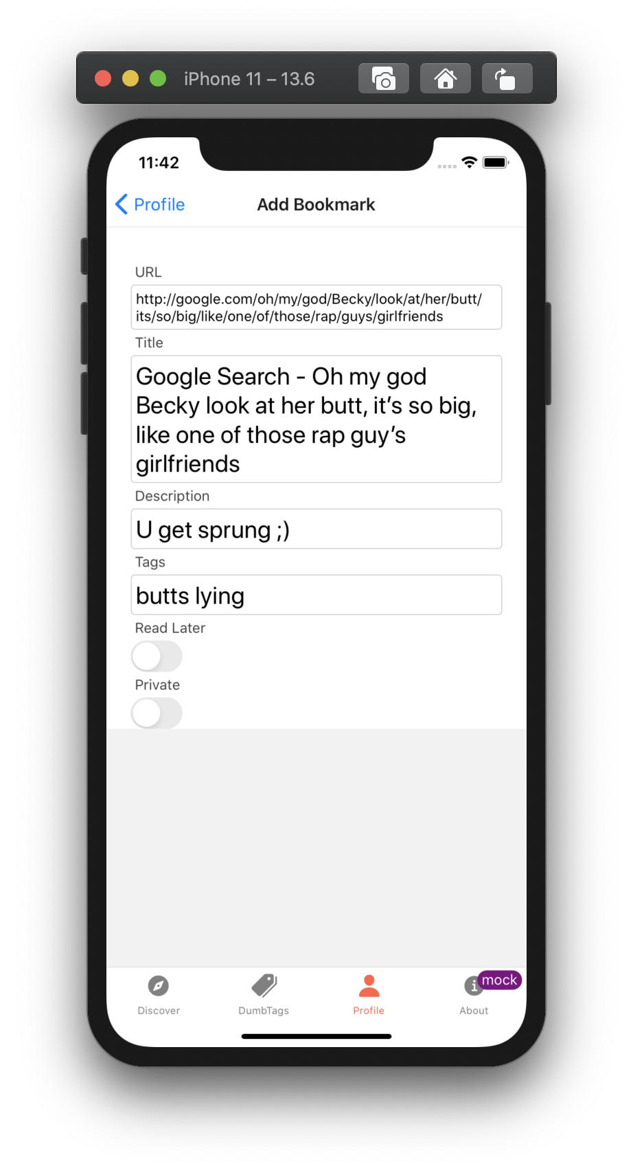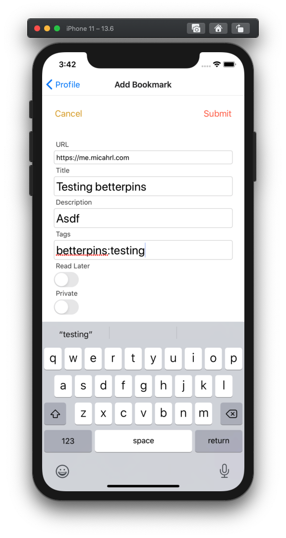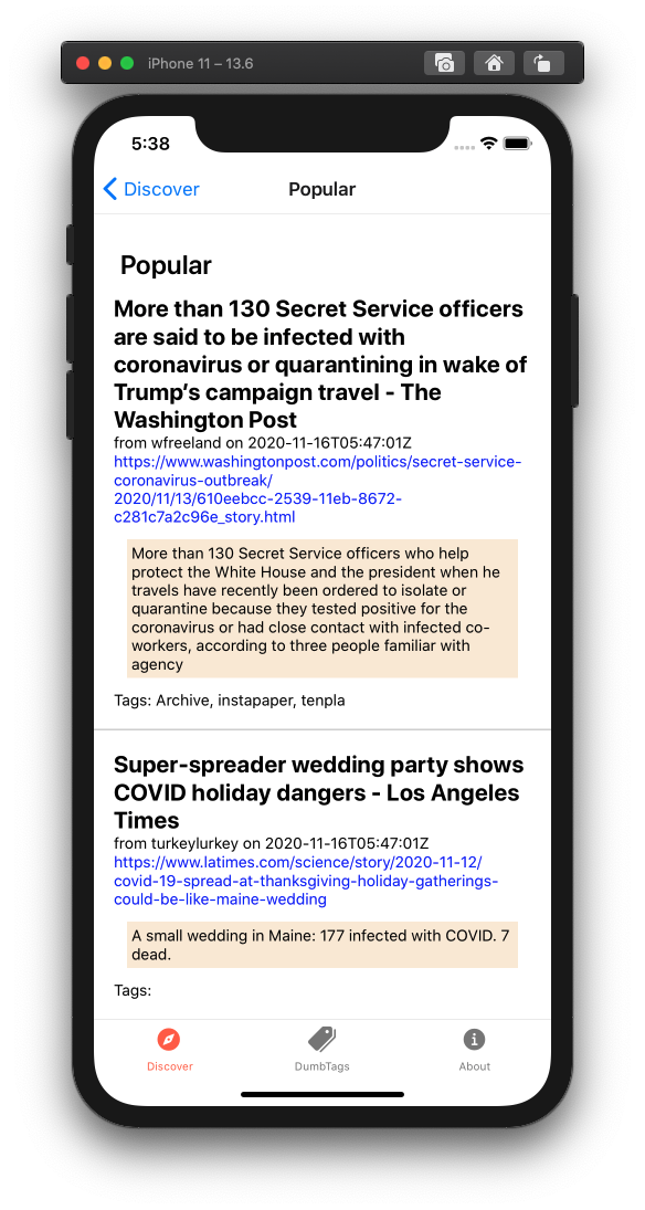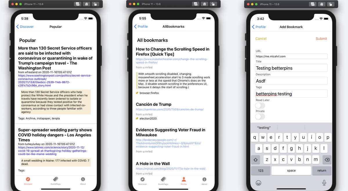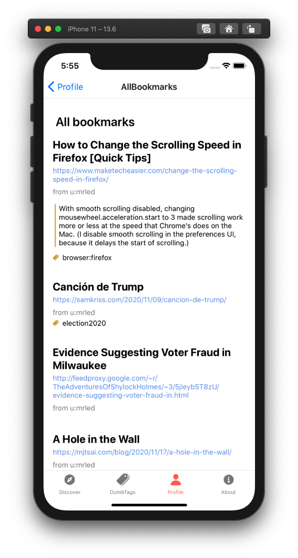 The mobile client space in 2020 and the first part of 2021 was absolutely dire. The best clients had been broken in obvious ways for years, and using Pinboard was becoming worse and worse. When I began to rely on the Pinboard bookmarklet, I decided to write my own client.