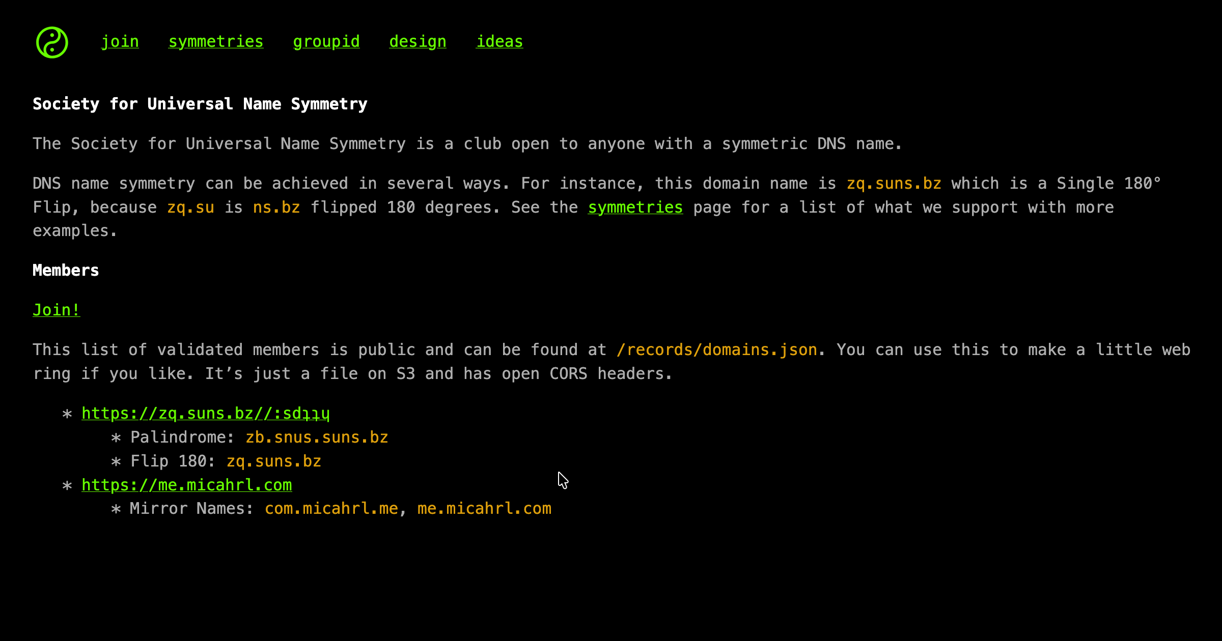 This is a club that anyone can join, all you need is control of a DNS zone. To prove membership, you need to attest that you control a symmetrical domain (or group of domains). There are several types of symmetry, and we’d love participation from anyone with more ideas.