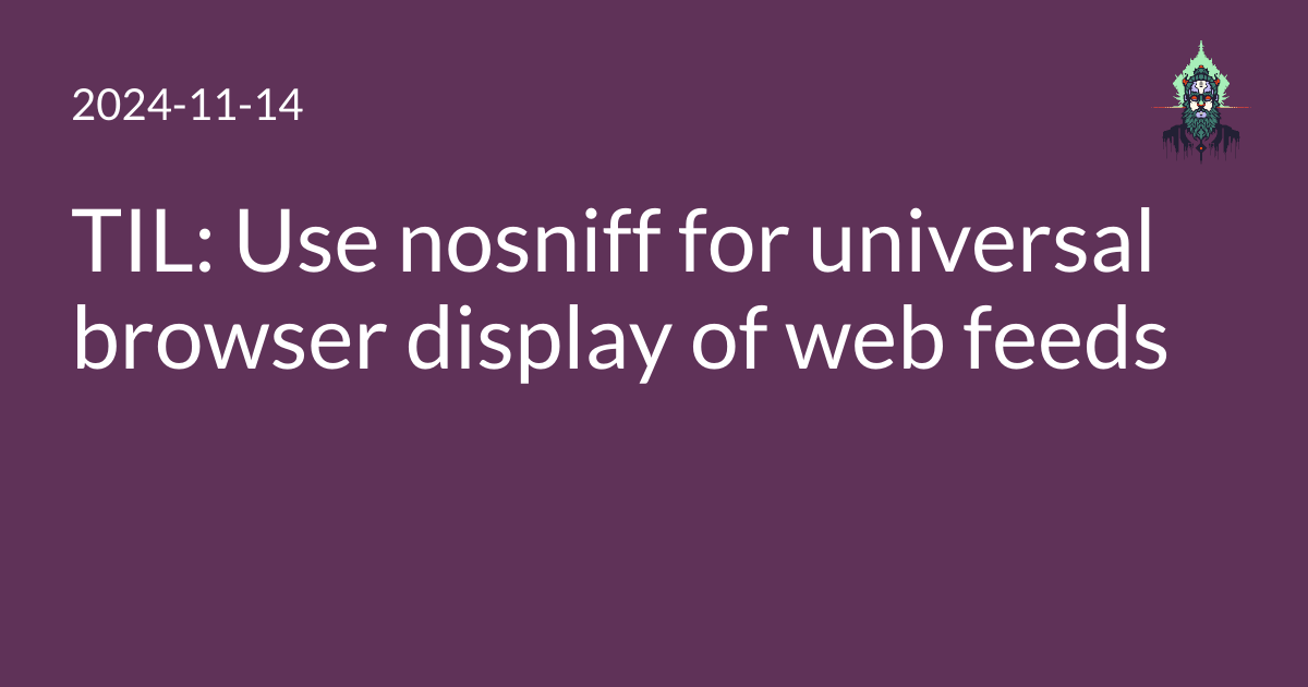 I had seen that XSL stylesheet before, but hadn’t read it closely. I took another look via a link from Keith Wagner’s blog post on feed styles, which I only found by searching for articles about RSS and nosniff.